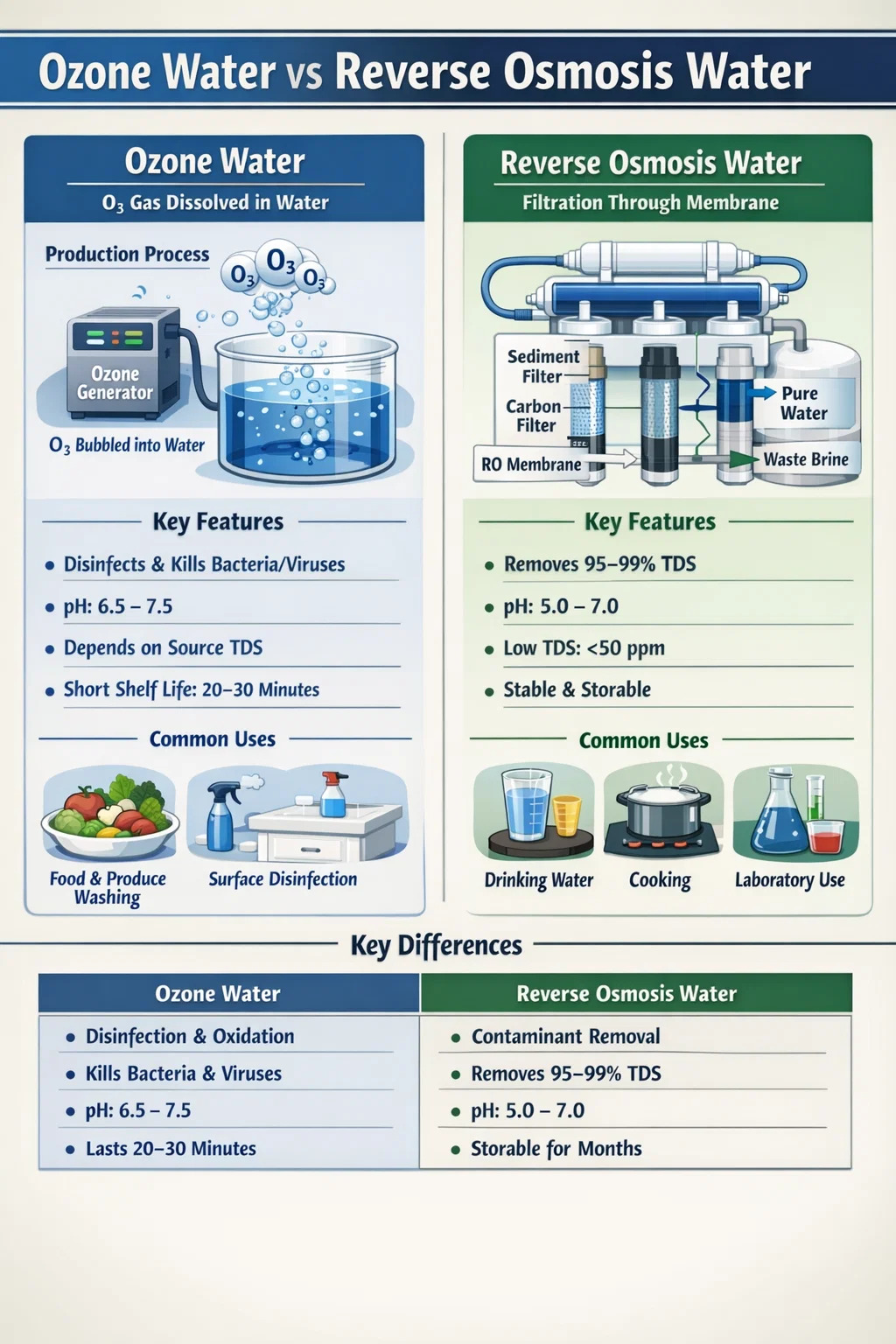 Ozonvann og omvendt osmosevann er ikke det samme, og de er ikke utskiftbare. Ozonvann er vann som brukes som et aktivt desinfeksjonsmiddel; RO-vann er vann hvor forurensninger er fysisk fjernet. Den første fungerer gjennom kjemi - oksidasjon og mikrobiell ødeleggelse. Den andre fungerer gjennom fysikk - trykkfiltrering på molekylær skala.